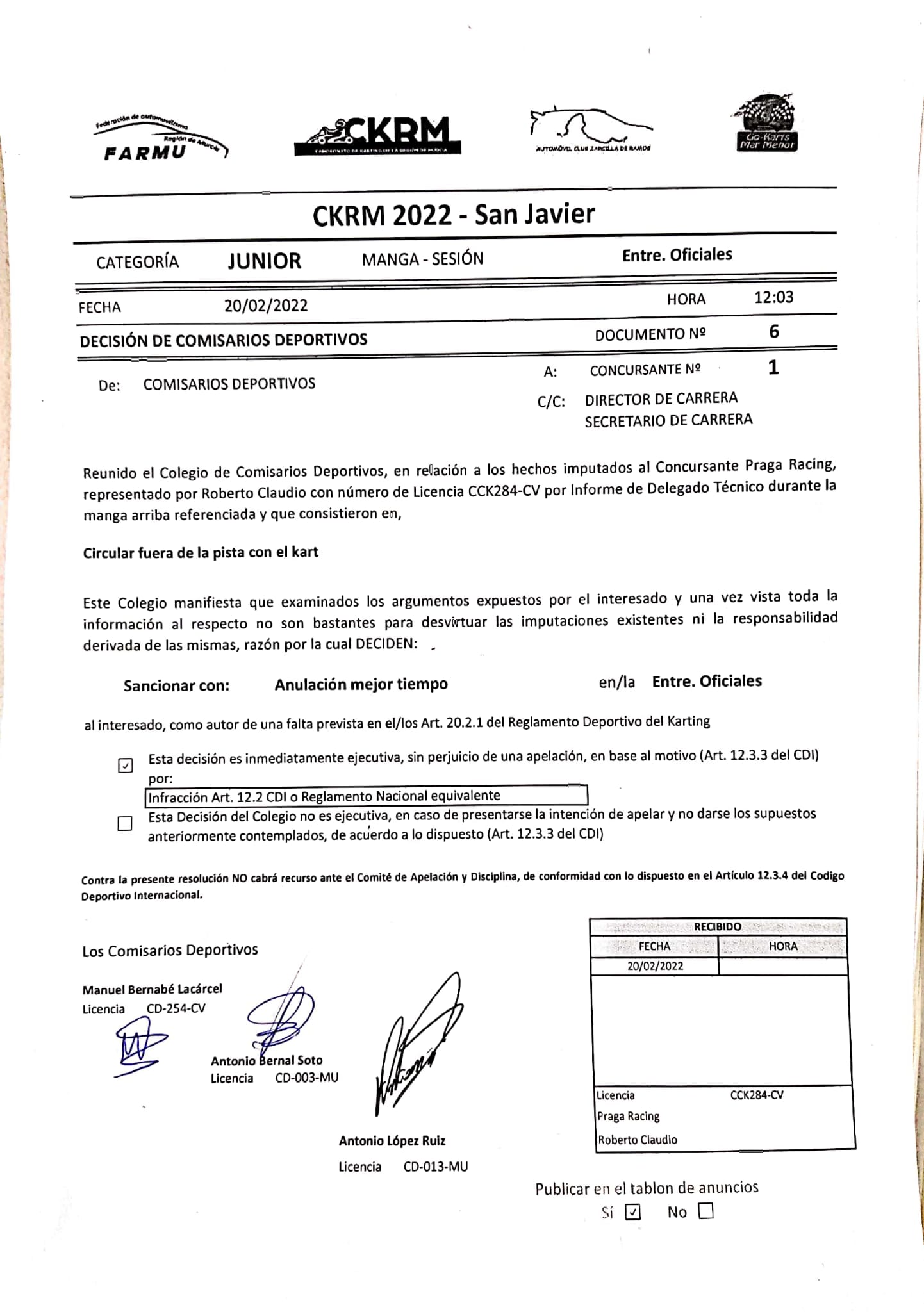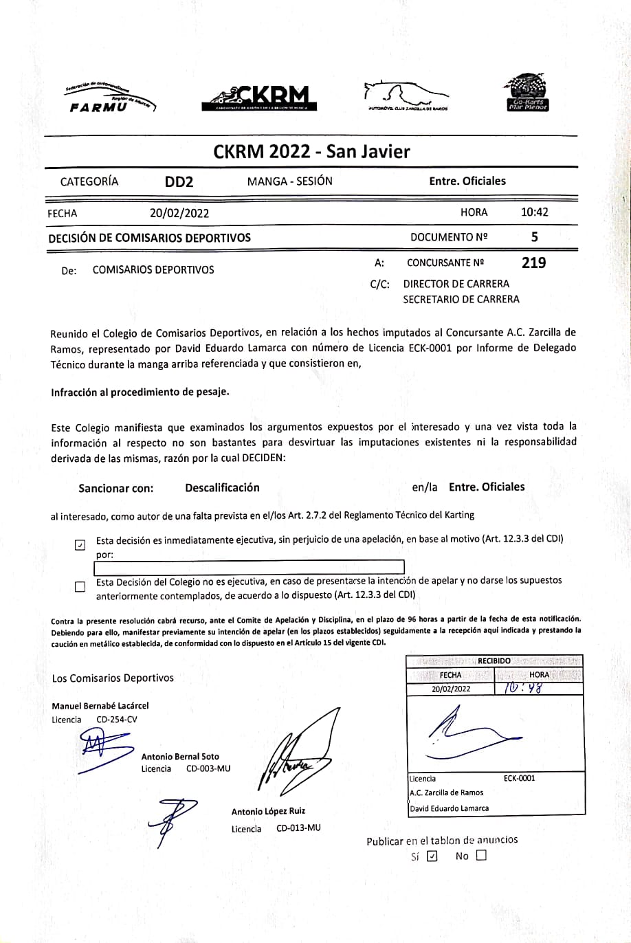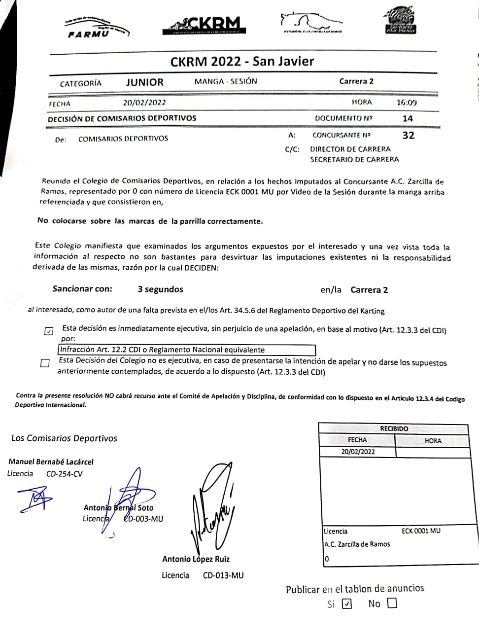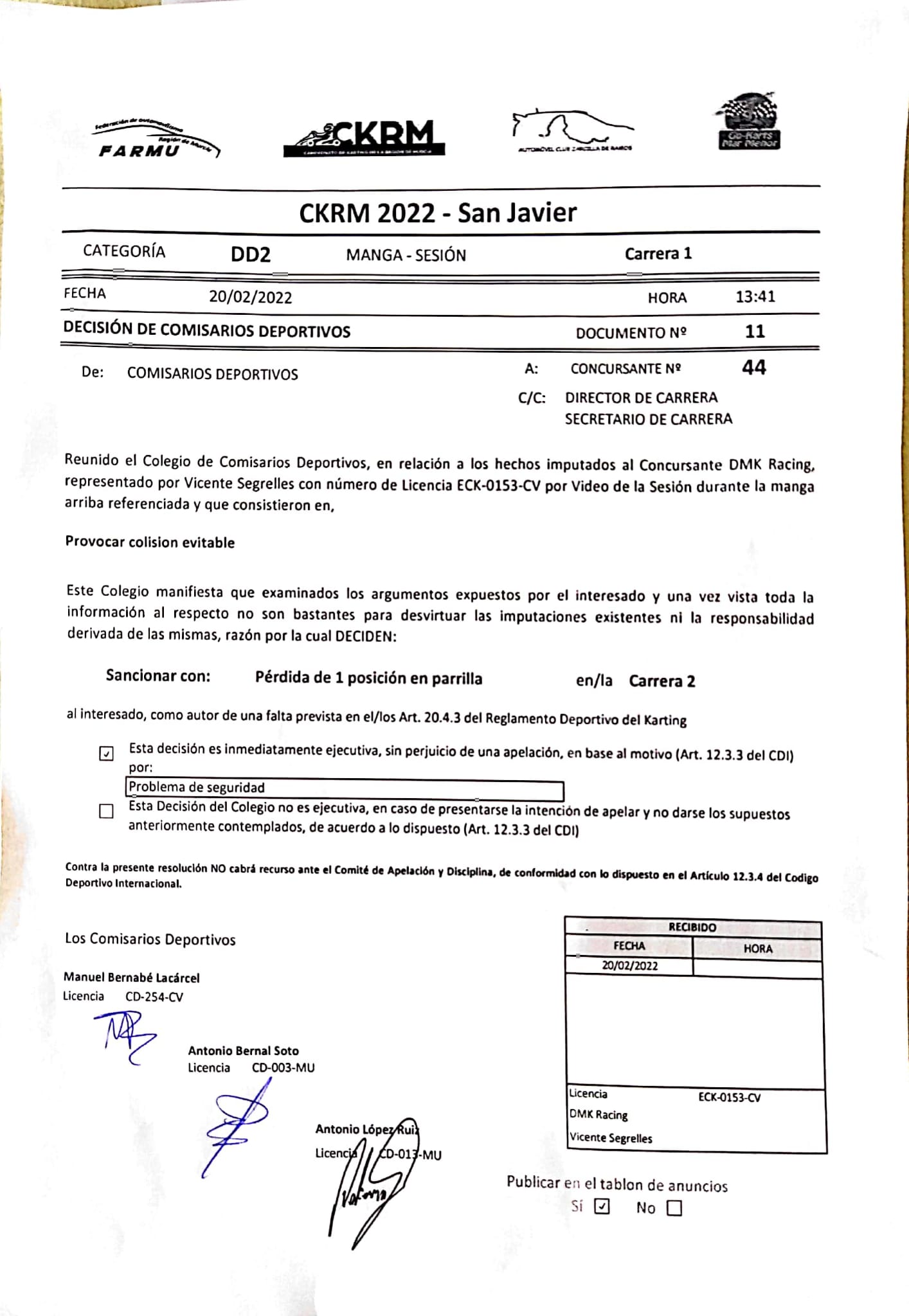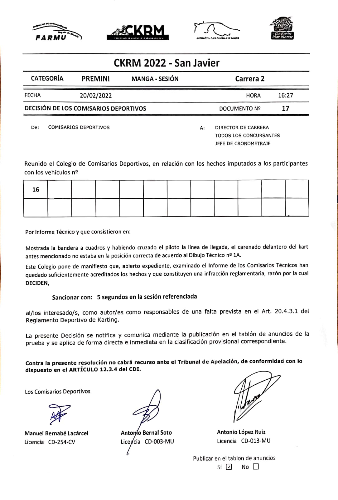 Lista de vehículos a tomar la salida de entrenos y carrera oficial